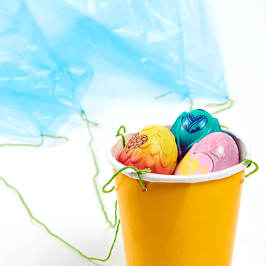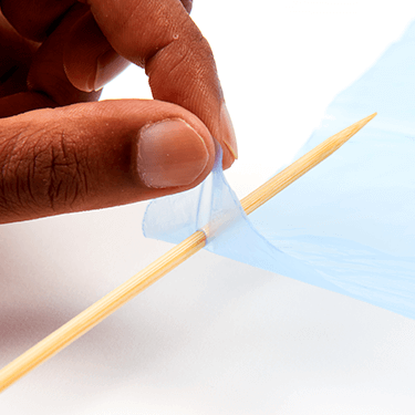 Cut four pieces of string the same length (minimum 20 inches) and tie one end of each string to each corner of the parachute.