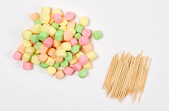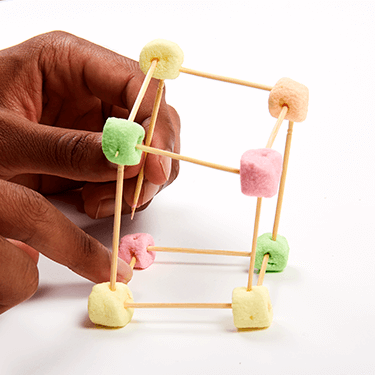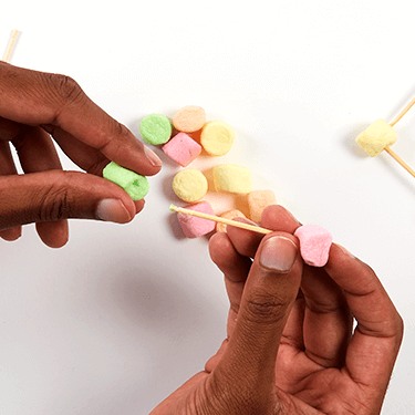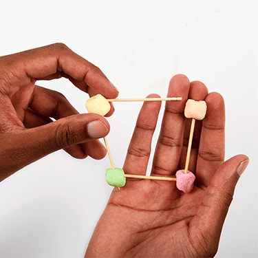 Make a square base by connecting four marshmallows to the end of four toothpicks or dry spaghetti pieces.